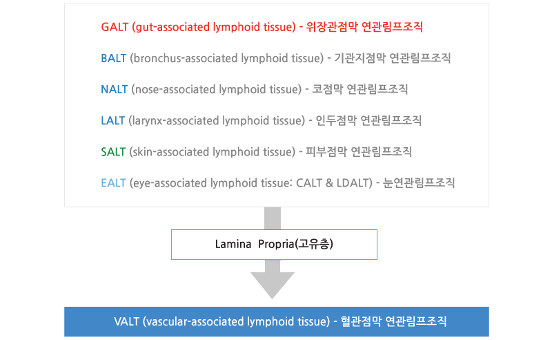 MALT은 위장관, 갑상선, 가슴(유방), 폐, 침선, 눈, 피부 등에 퍼져 있는 림프조직의 집합체로서 그 중에서도 GALT(Gut Associated Lymphoid Tissue:위장관연관림프조직)에서 백혈구를 훈련하고 분화시키는 역할을 담당하므로 후천적 면역계의 평형을 유지시키는 면역계의 중심부라 할 수 있다.